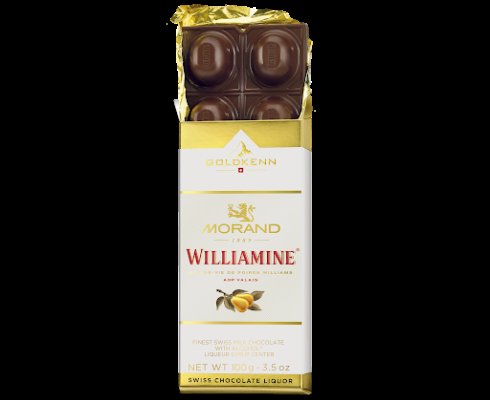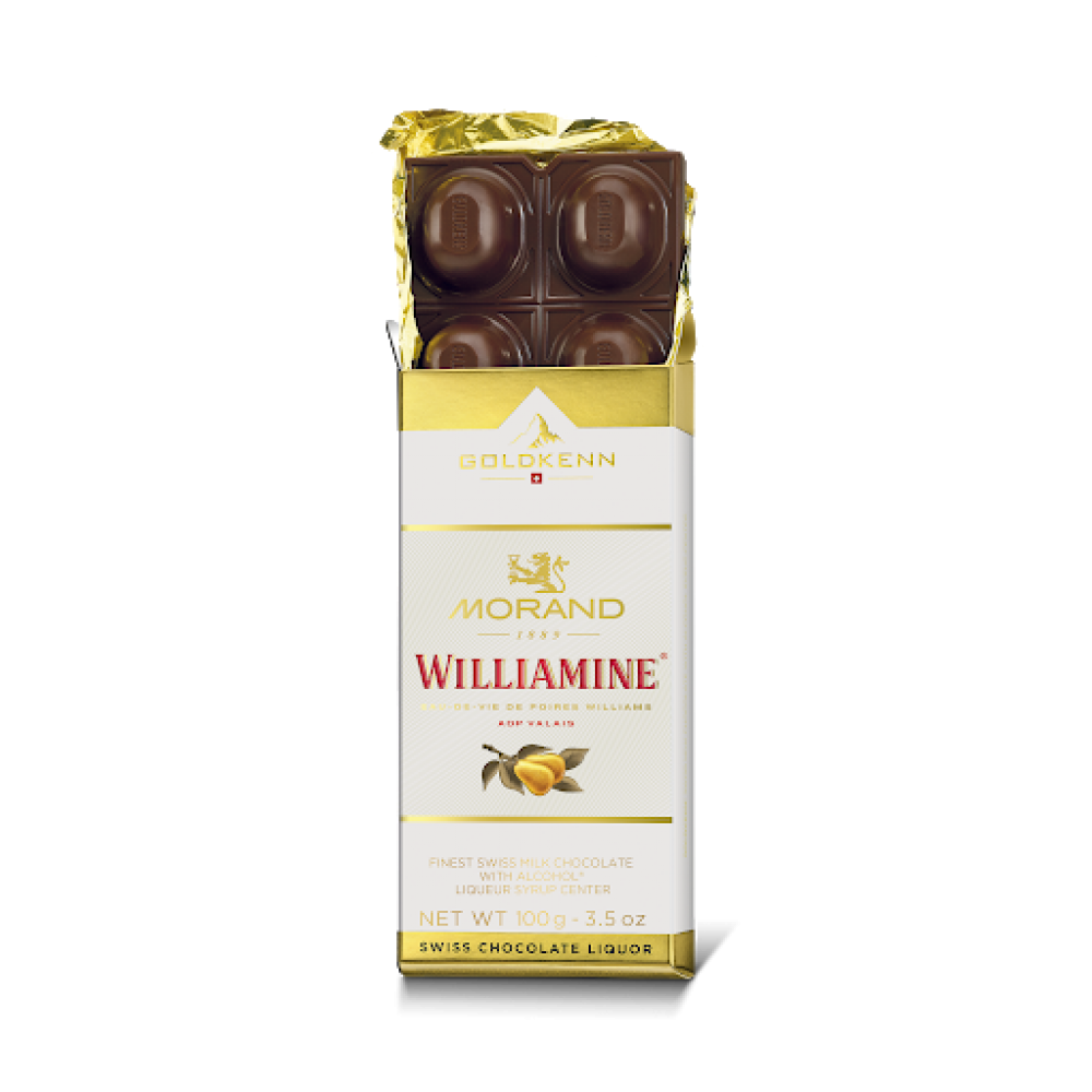Okusna švicarska tablica iz mlečne čokolade (37% kakav), napolnjena z likerjem iz hrušk Morand Williamine.